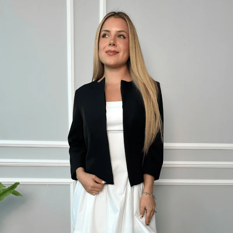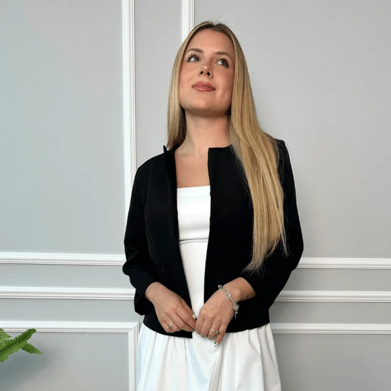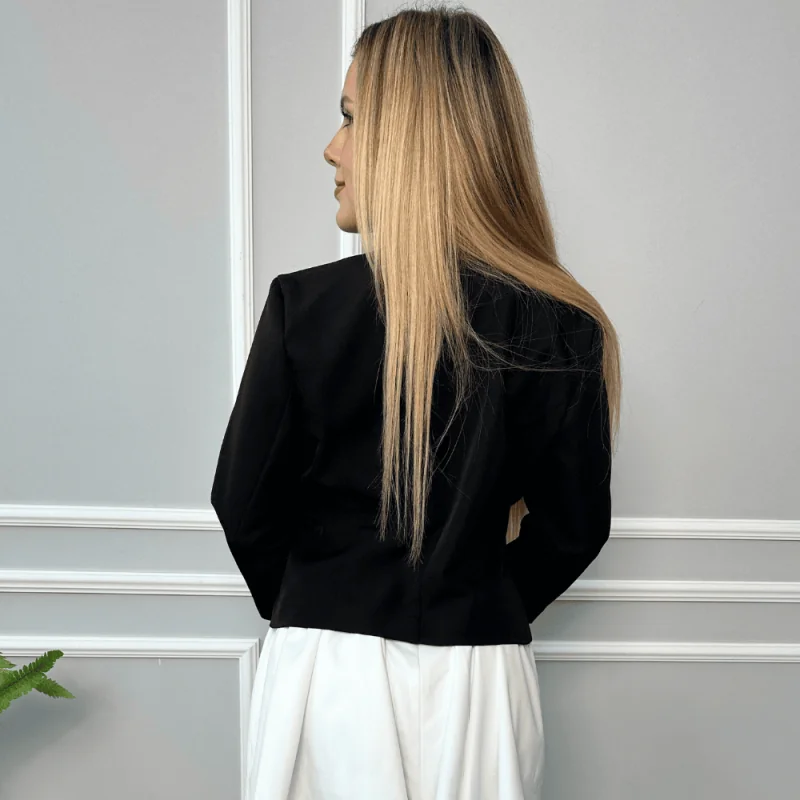 Casaca de cuero vegano, con cierre díagonal, botones de presión y cierre en los puños. cuenta con bolsillos delanteros con cierre y forro interno embolsado. puedes usarlo con nuestros modelo de vestido sami como nos muestra la foto. composición: cuero vegano.