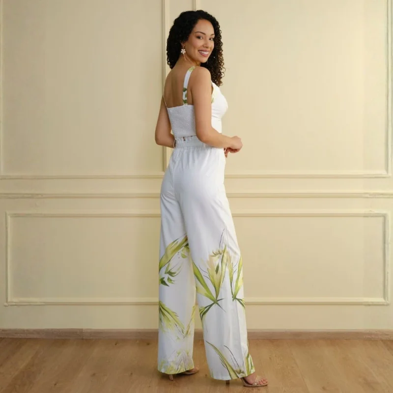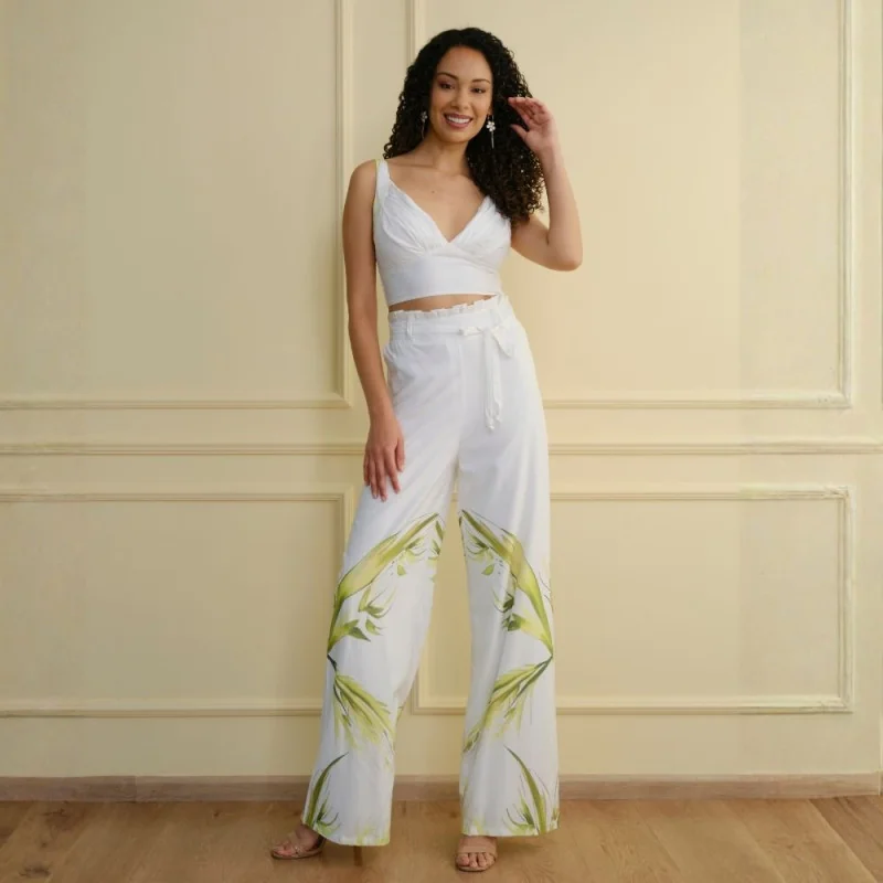 Este hermoso set en seda francesa es perfecto para eventos de día. el top tiene la espalda elasticada, escote en v con un ligero plisado. el pantalón lleva elástico en la cintura es de corte amplio palazo y un cinturón de tela muy sutil. composición: .