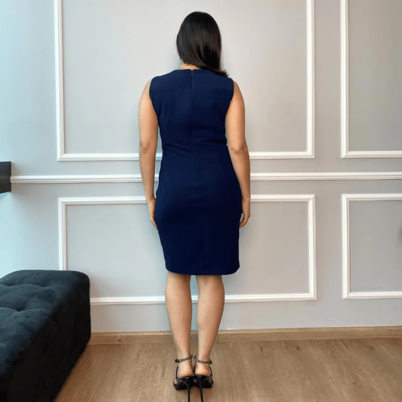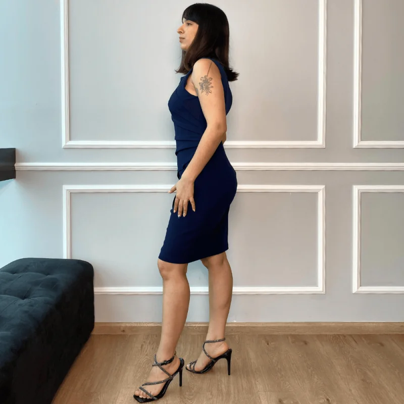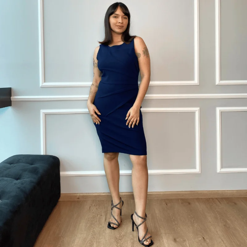 Vestido corto, cocktail de cuello redondo con detalle de pliegues que inician a un lado de la cintura y se expande, lo que hace que se enfoque en la cintura y favorece al estilizado de la silueta.