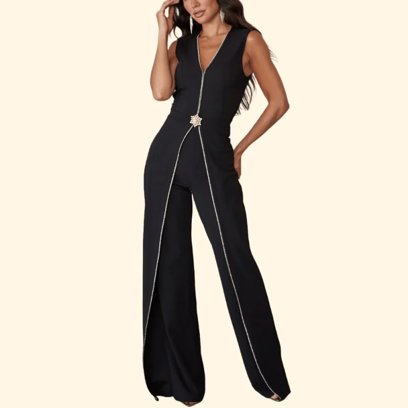 Enterizo en color negro, perfecto para cuanquier evento de noche, es súper elegante ya que cuenta con aplicación de strass desde el escote hasta la capa de la parte del pantalón en sentido vertical. ese efecto ayuda a estilizar la silueta. la parte de la espalda es cerrada con un cierre. composición: 100% poliéster.