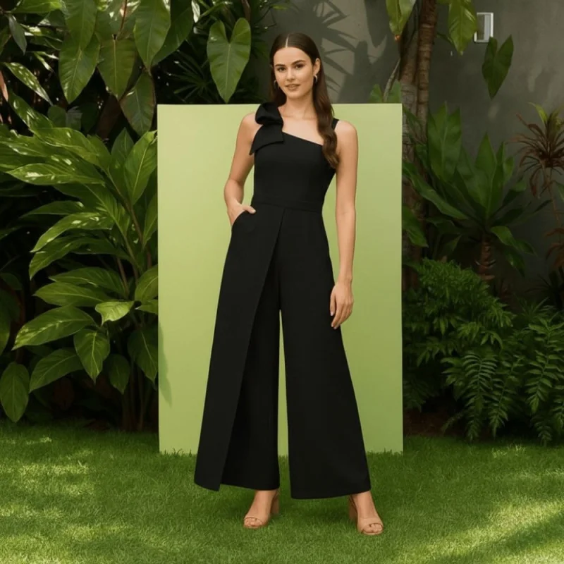 Enterizo palazo, nuestro hermoso enterizo luciana, es de corte strapless con tiras delgadas con regulador si no deseas que sea strapless. tiene un escote en v con una aplicación de metal en la parte interna, con pretina y cierre en la parte de espalda, el pantalón lleva bolsillos lo cual lo hace mas versátil. composición: 100% poliéster.