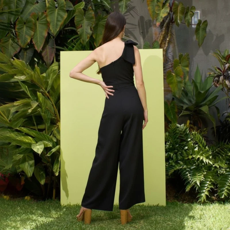 Enterizo en color negro, perfecto para cuanquier evento de noche, es súper elegante ya que cuenta con aplicación de strass desde el escote hasta la capa de la parte del pantalón en sentido vertical. ese efecto ayuda a estilizar la silueta. la parte de la espalda es cerrada con un cierre. composición: 100% poliéster.
