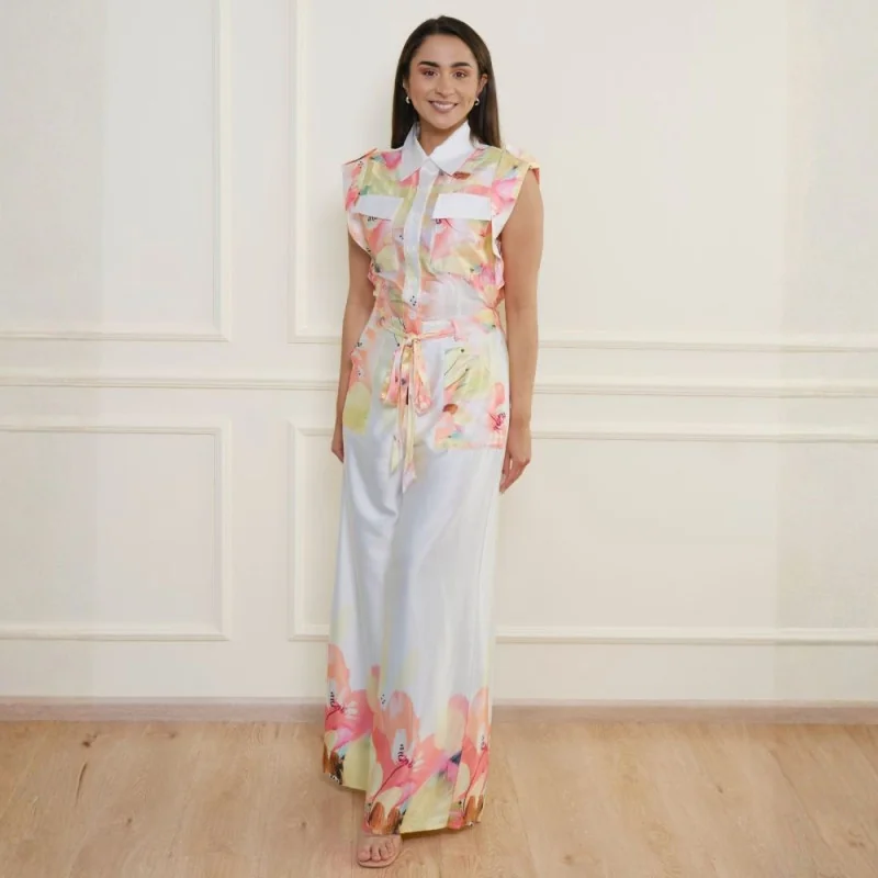 Hermoso enterizo de satín marfil con estampados tropicales. cuello camisero y cuenta con un cinturón para un mejor ajuste en la cintura. composición: .