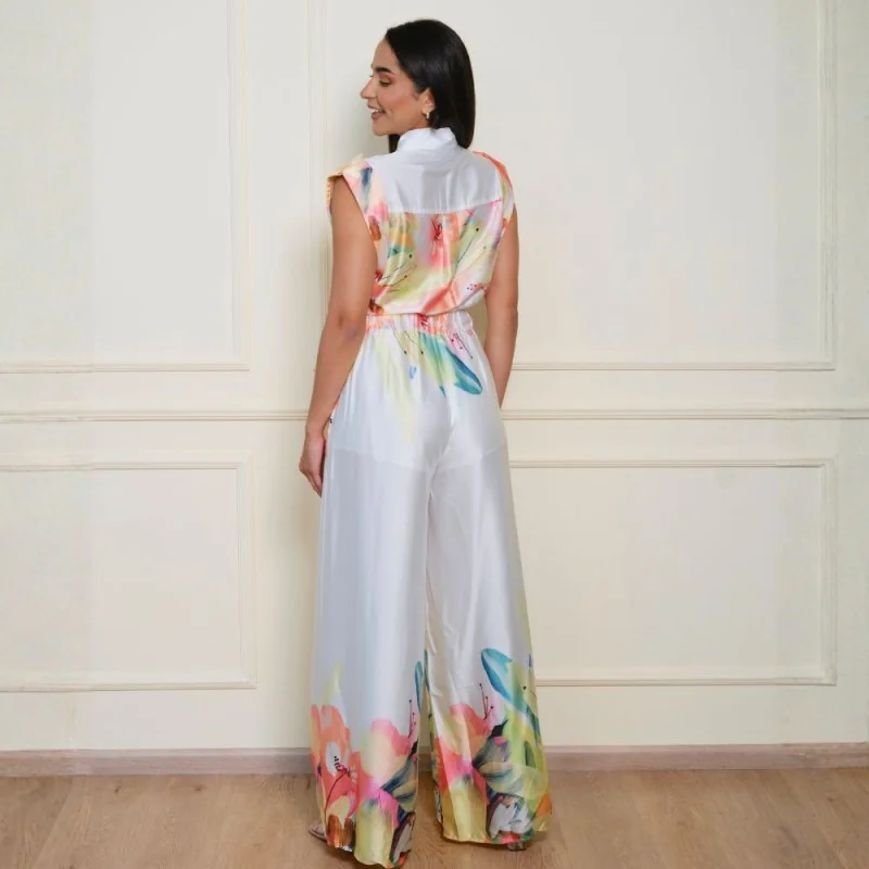 Elegante palazo con la parte de arriba de seda americana con diseño de cadenas, mangas cortas sueltas y ligeras. lleva un cinturón para marcar la cintura. composición: .