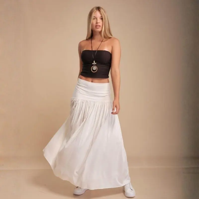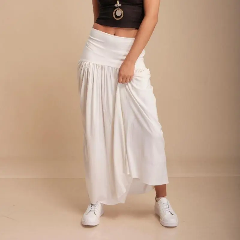 Hermosa maxi falda de chalis, con pretina elasticada en la parte de la espalda.