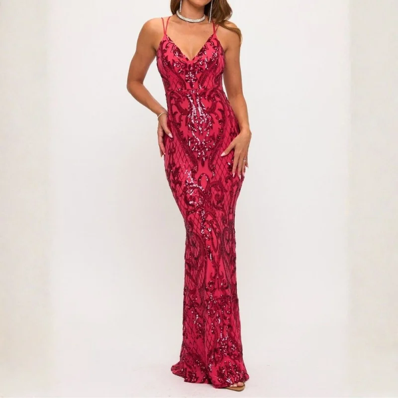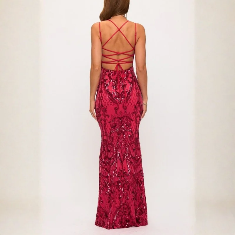 Vestido de lentejuelas pallete en corte sirena, la espalda lleva tirolés para tener un ajuste perfecto de la parte del busto.