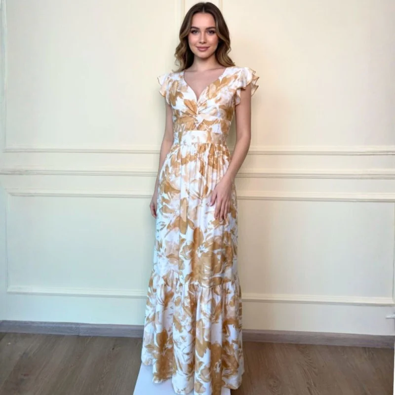 Hermoso vestido de gasa chiffon estampada con bellos detalles de gurbión en la falda y mangas, escote en v adelante y atrás y sexy abertura en la pierna. composición: .