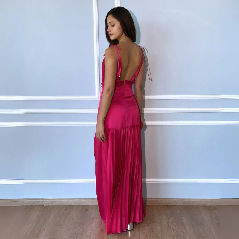 Vestido largo de satén de corte fluido con escote drapeado y espalda abierta con tiras ajustables. su caída suave realza la silueta con elegancia y comodidad, ideal para bodas, fiestas o eventos especiales. composición: .