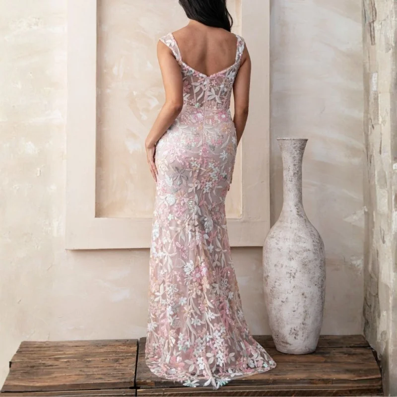 Hermoso maxi vestido en encaje pallete. corte sirena con hermosa abertura en la pierna, lleva copas incorporadas y delicada transparencia en el escote. composición: 100% poliéster.