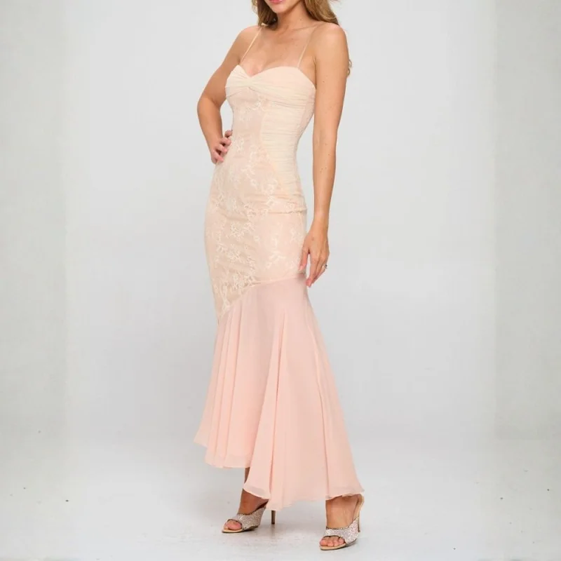 Vestido largo con escote drapeado y espalda abierta con hermoso detalle de encaje. su silueta sirena en tela suave realza las curvas con elegancia y movimiento. ideal para eventos de noche o celebraciones especiales. composición: .