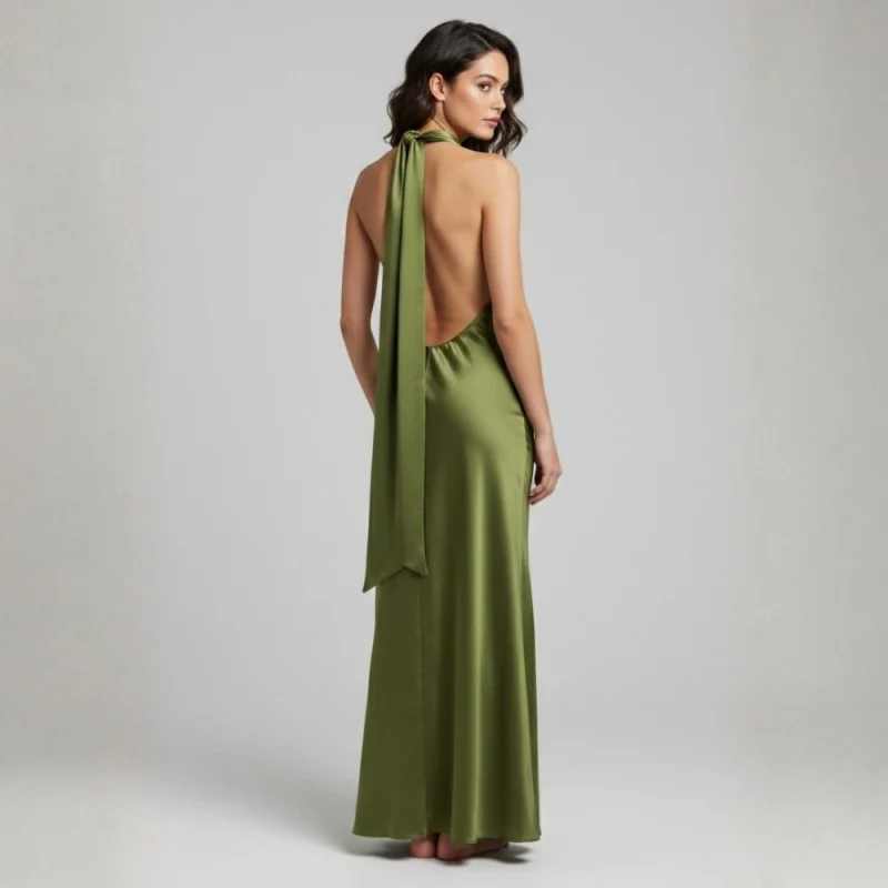 Vestido largo de satén con cuello alto y tiras cruzadas al cuello. su corte ajustado realza la figura y el faldón tipo sirena aporta movimiento y elegancia. el satén luminoso añade un toque de glamour perfecto para bodas, fiestas o eventos especiales. composición: .