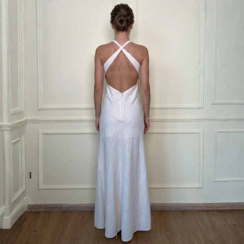 Vestido largo de satén con cuello alto y tiras cruzadas al cuello. su corte ajustado realza la figura y el faldón tipo sirena aporta movimiento y elegancia. el satén luminoso añade un toque de glamour perfecto para bodas, fiestas o eventos especiales. composición: .