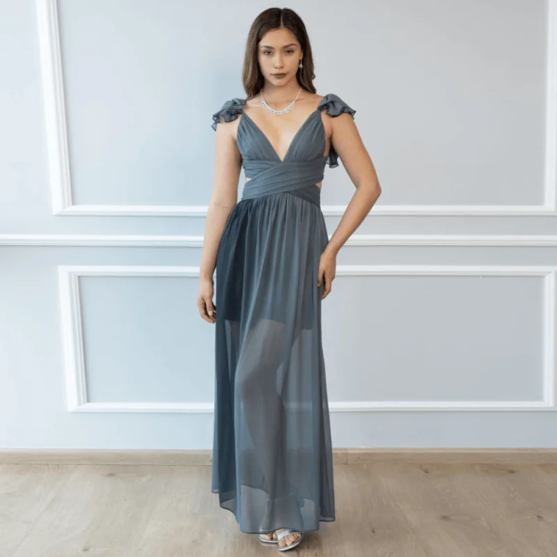 Hermoso vestido en gasa con escote en los lados de la cintura y espalda, con detalle tipo corset ajustable.