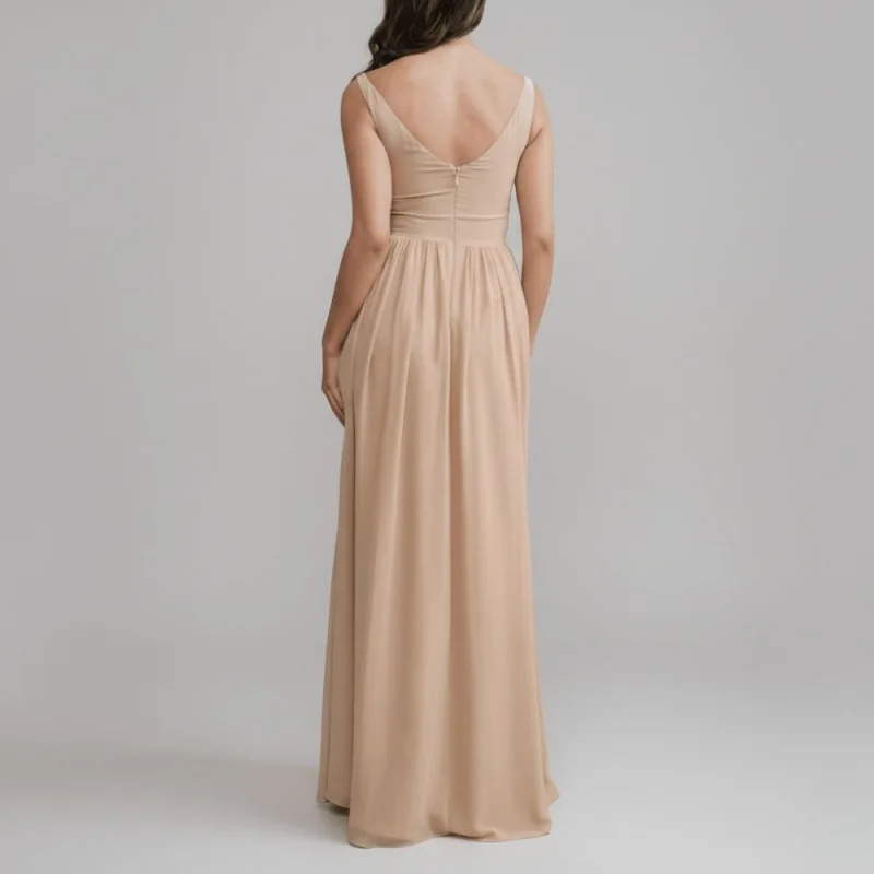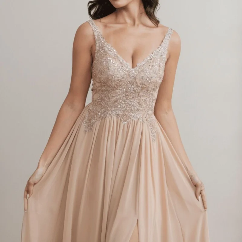 Elegante vestido largo con abertura en la pierna y bordado en el corpiño.