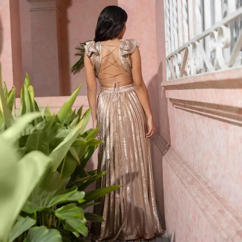 Hermoso vestido en lame totalmente plisado, con copas incorporadas y un hermoso escote con cruce de tiroléss en la espalda.