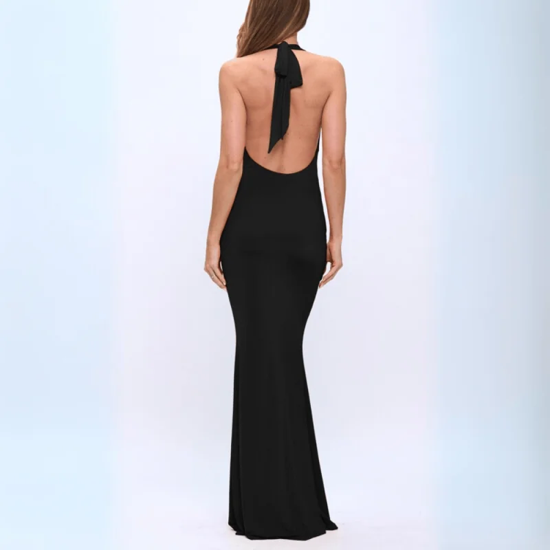 Nuestro hermoso vestido celosia es de licra americana en corte sirena, lleva caída de agua en el escote y es asimétrico en el cuello halter, con una hermoso detalle dorado.