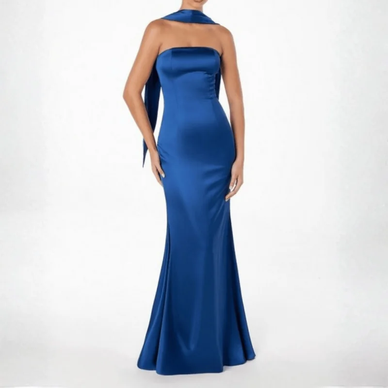 Vestido largo de satén con corte sirena y diseño strapless que realza los hombros y escote. incluye una banda de satén para el cuello que aporta un toque de elegancia y versátilidad. perfecto para galas y eventos formales. composición: .