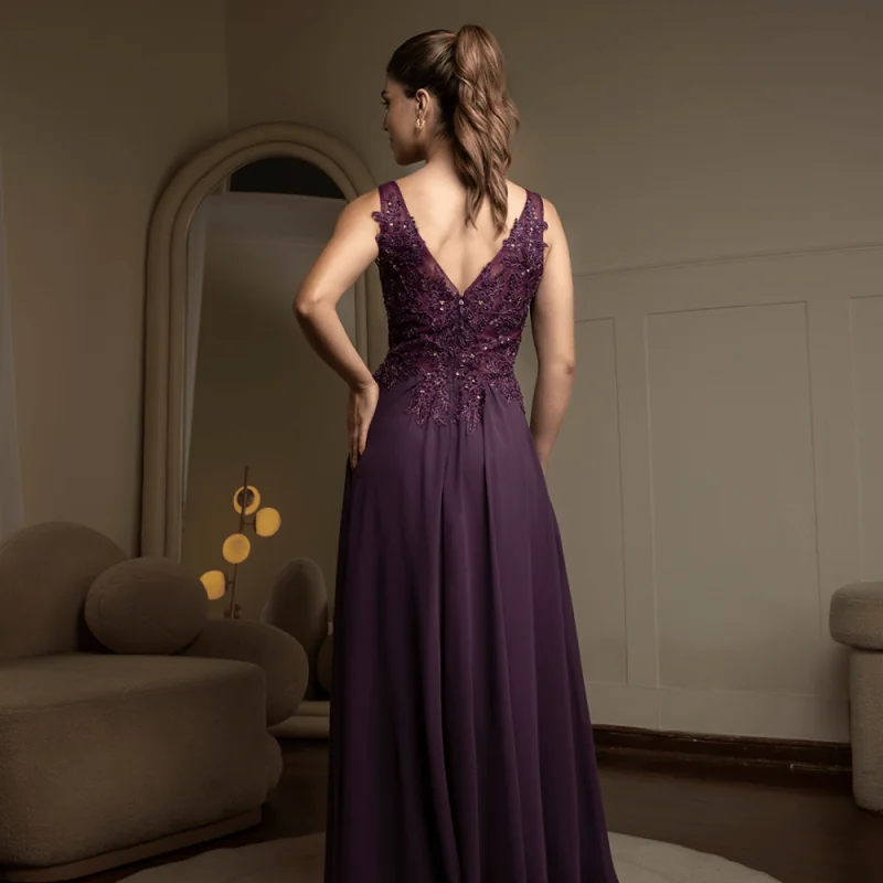 Hermoso vestido de gasa chiffon estampada con bellos detalles de gurbión en la falda y mangas, escote en v adelante y atrás y sexy abertura en la pierna. composición: .