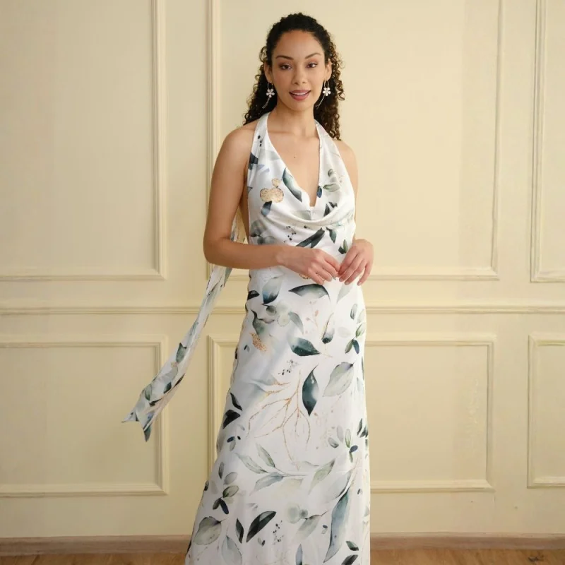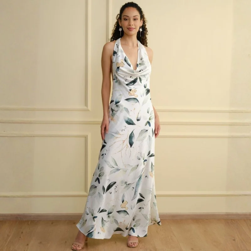 Vestido largo de satén con cuello alto y tiras cruzadas al cuello. su corte ajustado realza la figura y el faldón tipo sirena aporta movimiento y elegancia. el satén luminoso añade un toque de glamour perfecto para bodas, fiestas o eventos especiales. composición: .