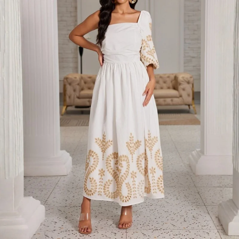 Hermoso vestido de popelina de algodón, con una sola manga bubble, lleva delicado calados tipo brodery en manga y falda. el pecho es drapeado por atrás y adelante, lleva cierre al costado. composición: .