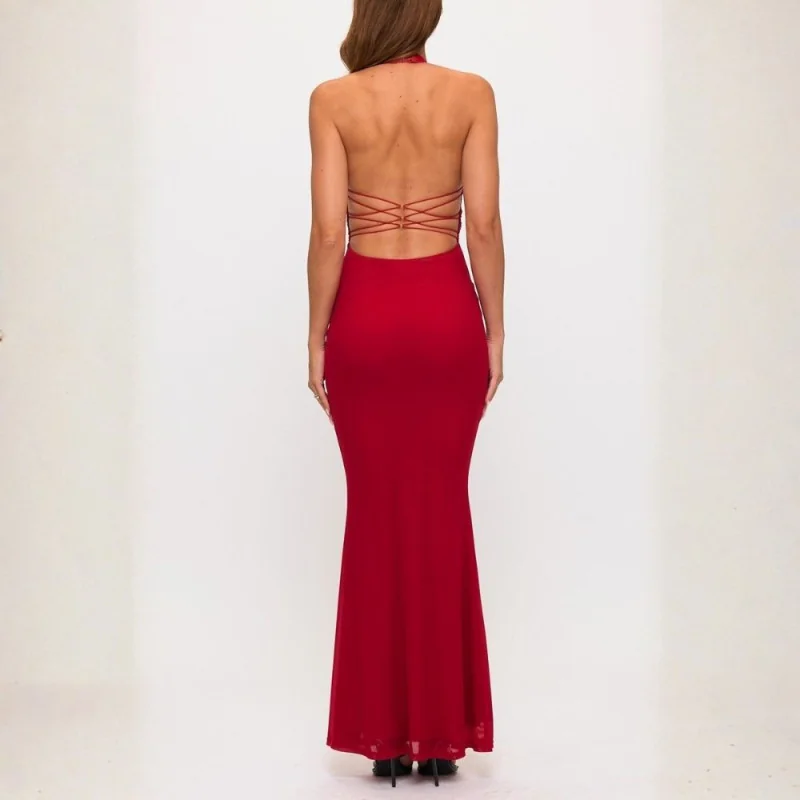 la falda es corte sirena, el busto escote halter, y la espalda tiene un escote con tiras.