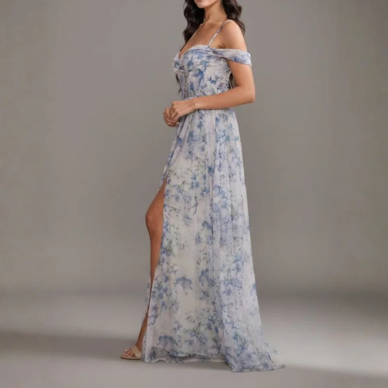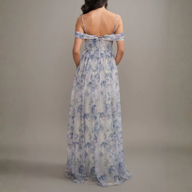 Hermoso maxi vestido de organza con tiras regulables, mangas caídas en los hombros, corpiño estilo corset y abertura en la pierna.
