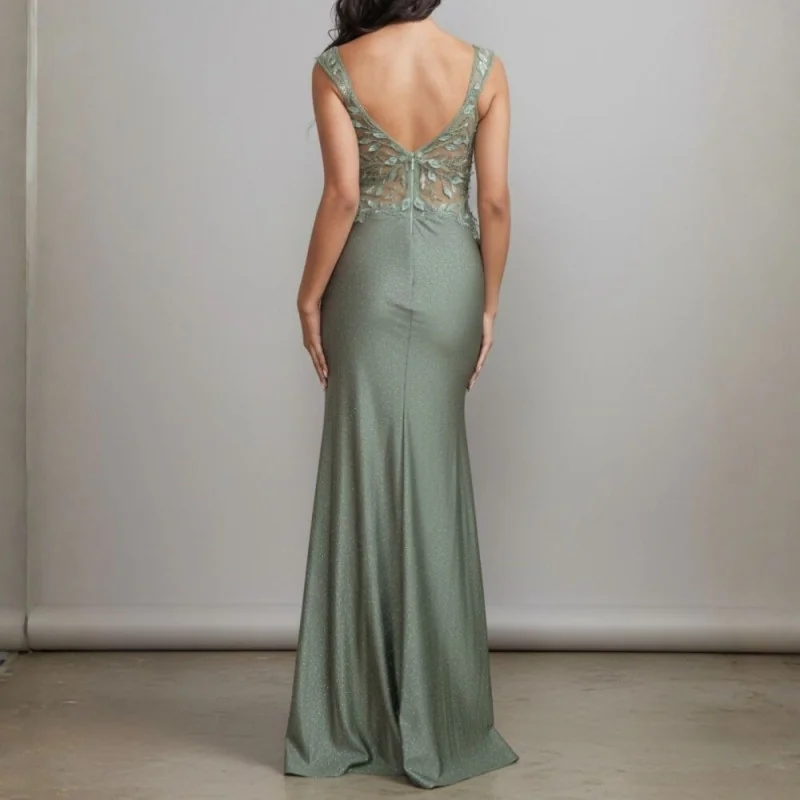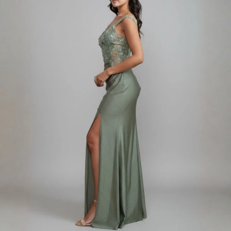 Hermoso vestido largo en corte sirena con abertura en la pierna.