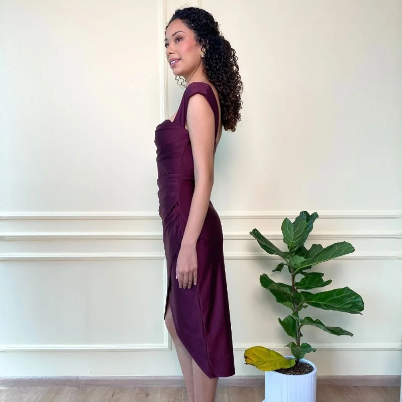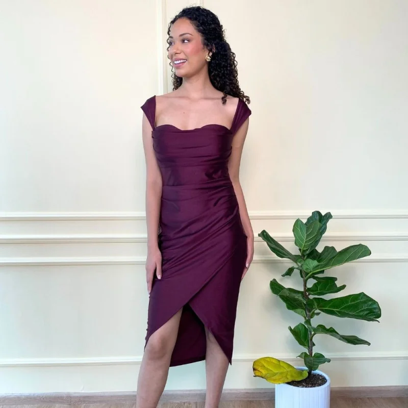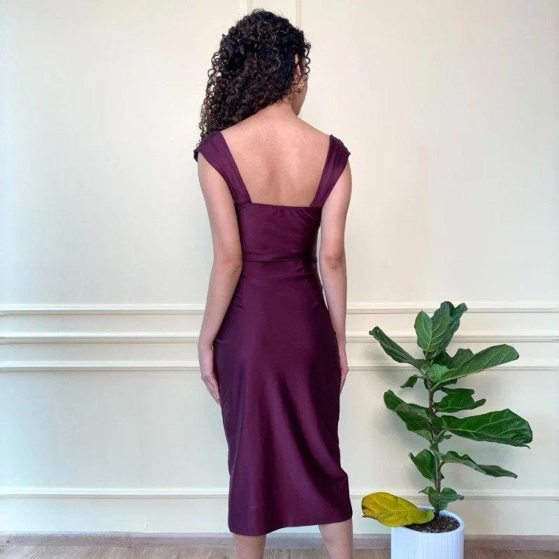cuenta con detalles en la parte delantera del corpiño y unas ligeras mangas bajo el hombro, tiene la falda con cruce en la parte delantera que hará lucir una abertura.