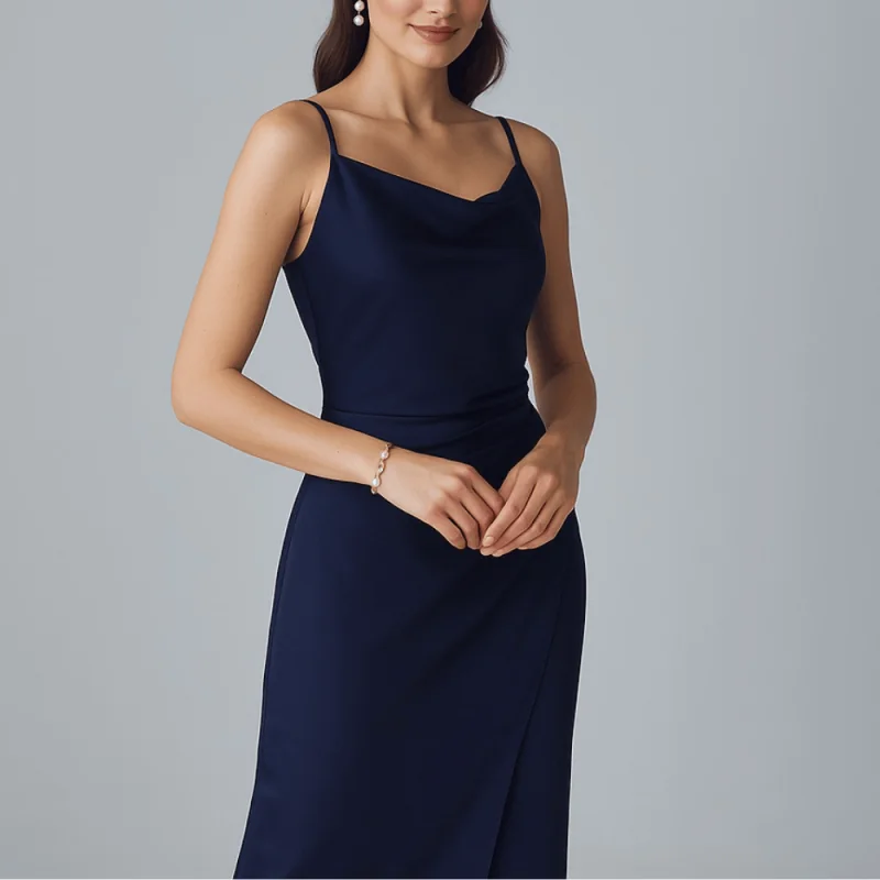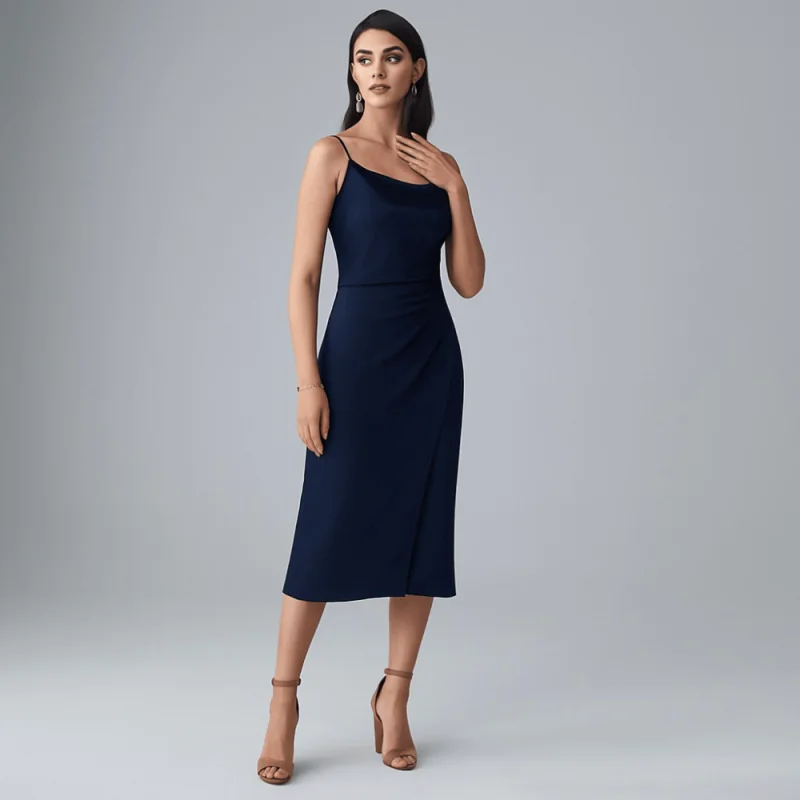 Vestido midi ideal para eventos como graduación, cocktail, matrimonio civil como invitada, material principal de satín, color entero y estampados, consta de dos tiras con regulador en la parte de la espalda, tiene corte ajustado en la parte superior y la falda recta con pliegues a un lado que hace un efecto envolvente, falda 3/4 sin forro. composición: seda 96% polyester – 4% spandex.