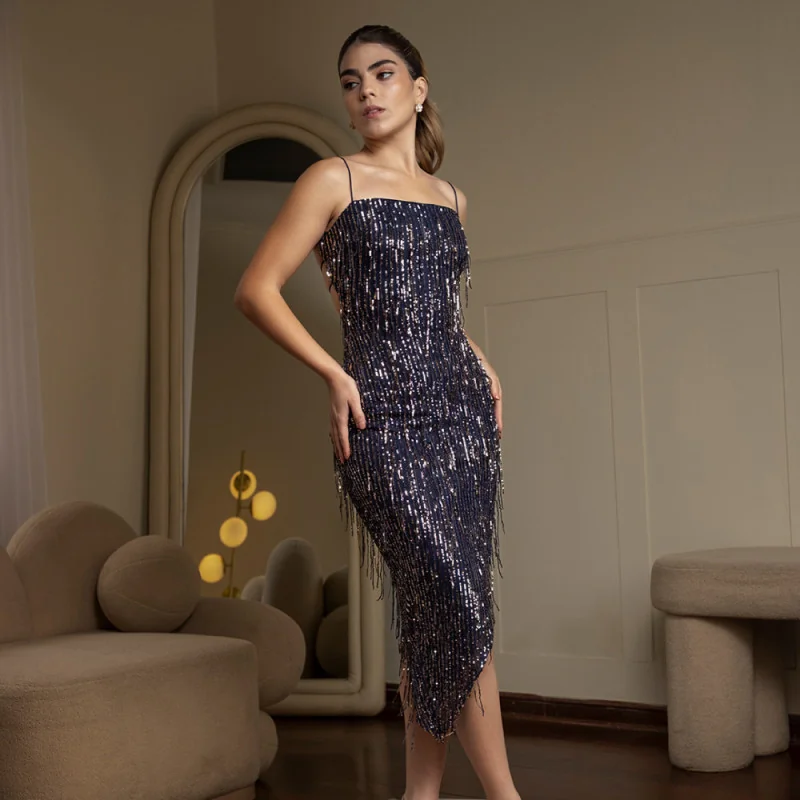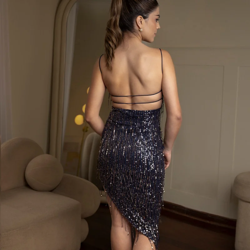 Hermoso vestido con falda asimétrica, la tela es de licra con lentejuelas colgantes, generando un efecto muy libre y fresco.