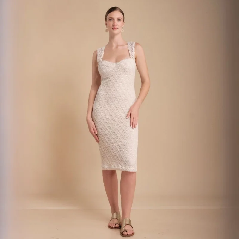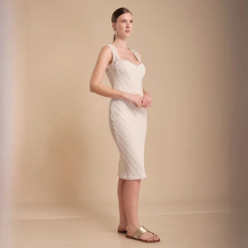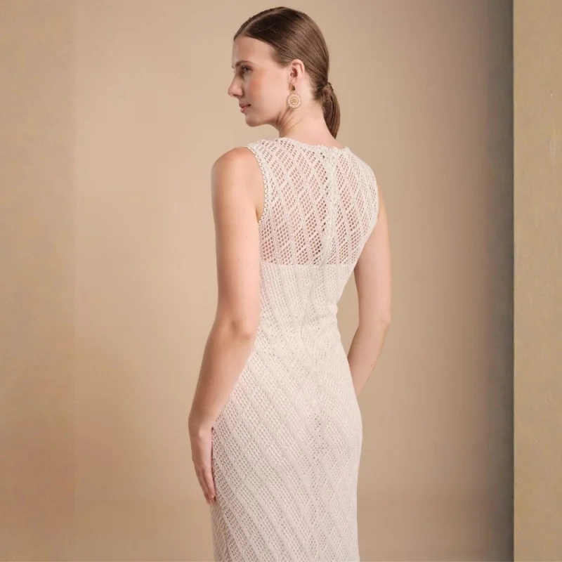 Hermoso vestido tejido con tiras gruesas y transparencia en la espalda.
