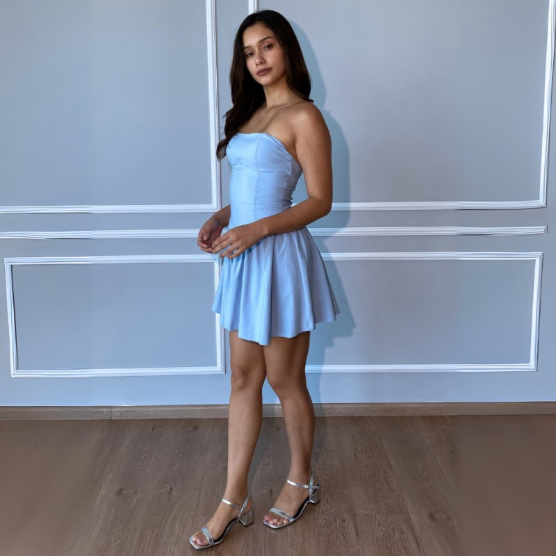 Vestido tipo cocktail con corset en corte strapless y copa incorporada.