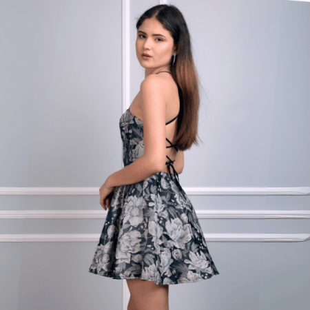 Vestido corto en strapless en brocado americano, tiene tiras cruzadas en la parte de la espalda oara un ajuste perfecto.