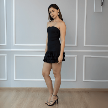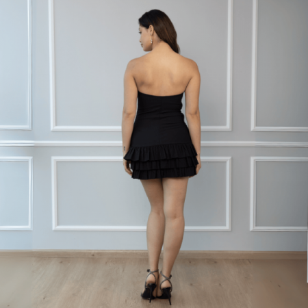 Hermoso vestido strapples, únicolor, de tela barcelona licrada que se amolda a la silueta, cuenta con 3 bobos en la falda.
