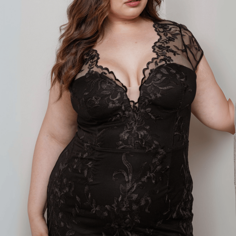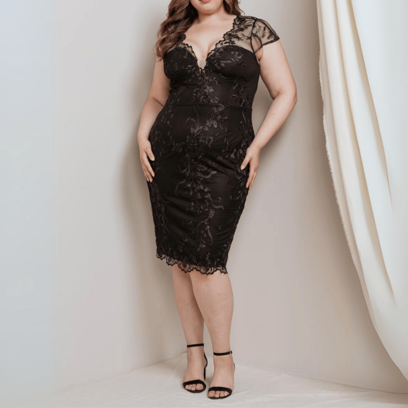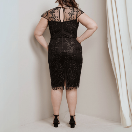 Hermoso vestido en color negro de tul bordado, midi y de corte recto.