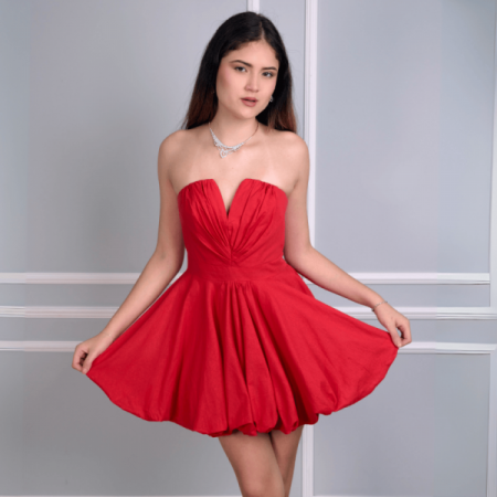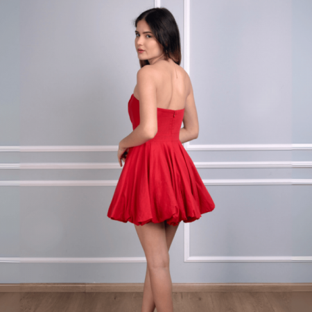Hermoso vestido corto strapless con falda acampanada globo en lino.