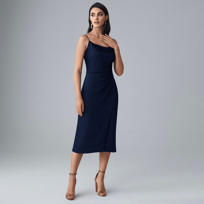 Vestido midi ideal para eventos como graduación, cocktail, matrimonio civil como invitada, material principal de satín, color entero y estampados, consta de dos tiras con regulador en la parte de la espalda, tiene corte ajustado en la parte superior y la falda recta con pliegues a un lado que hace un efecto envolvente, falda 3/4 sin forro. composición: seda 96% polyester – 4% spandex.