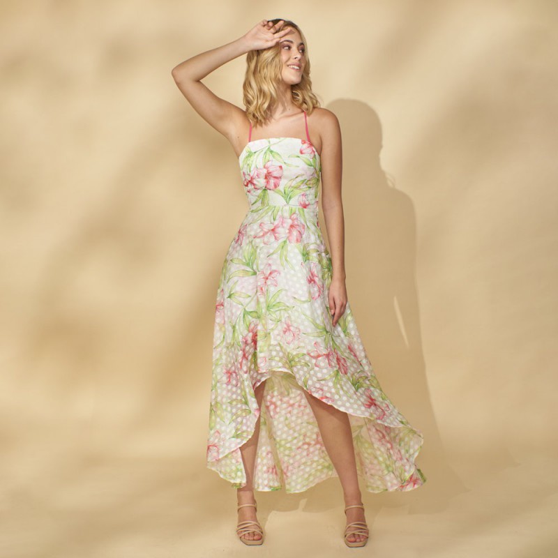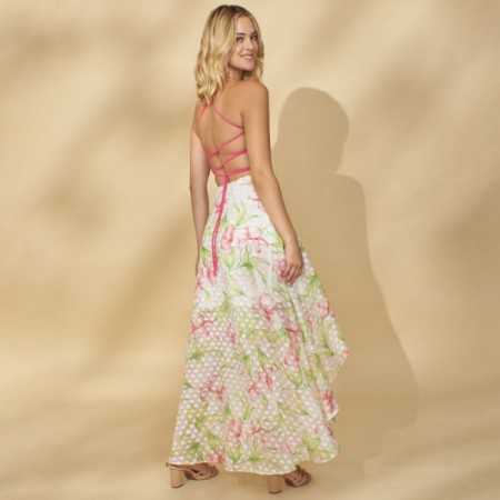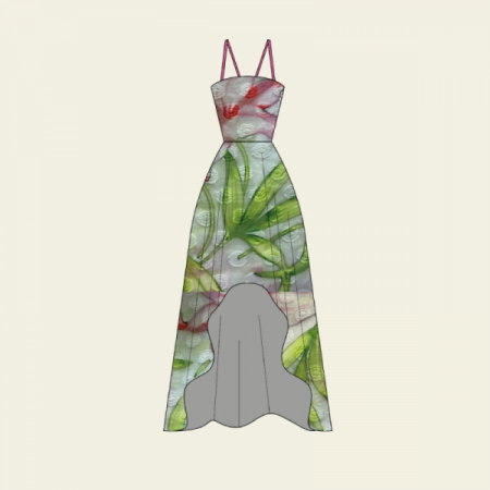 Vestido maxi con cola, largo la parte de la falda posterior y en la parte delantera corta aprox sobre la rodilla, tiene la parte del corpiño corte strapless, con dos tiras largas que se cruzan en la parte de la espalda y se coloca en zigzag para entallarlo a medida tipo corset.