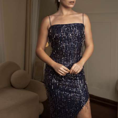 Hermoso vestido con falda asimétrica, la tela es de licra con lentejuelas colgantes, generando un efecto muy libre y fresco. La espalda es de tiras horizontales de lado a lado.