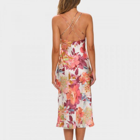 Hermoso vestido midi de satín sublimado en colores pasteles y diseños floreados con fondo marfil.