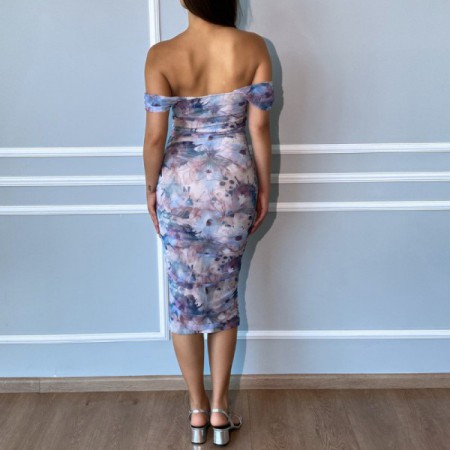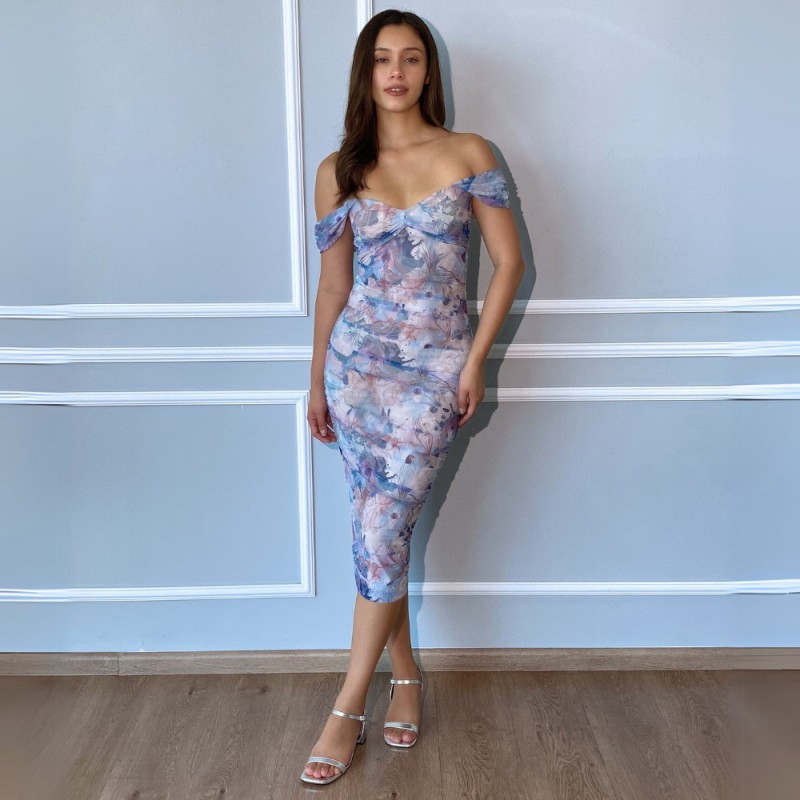 Vestido midi en tul licrado estampado, strapless con mangas caídas luciendo los hombros.