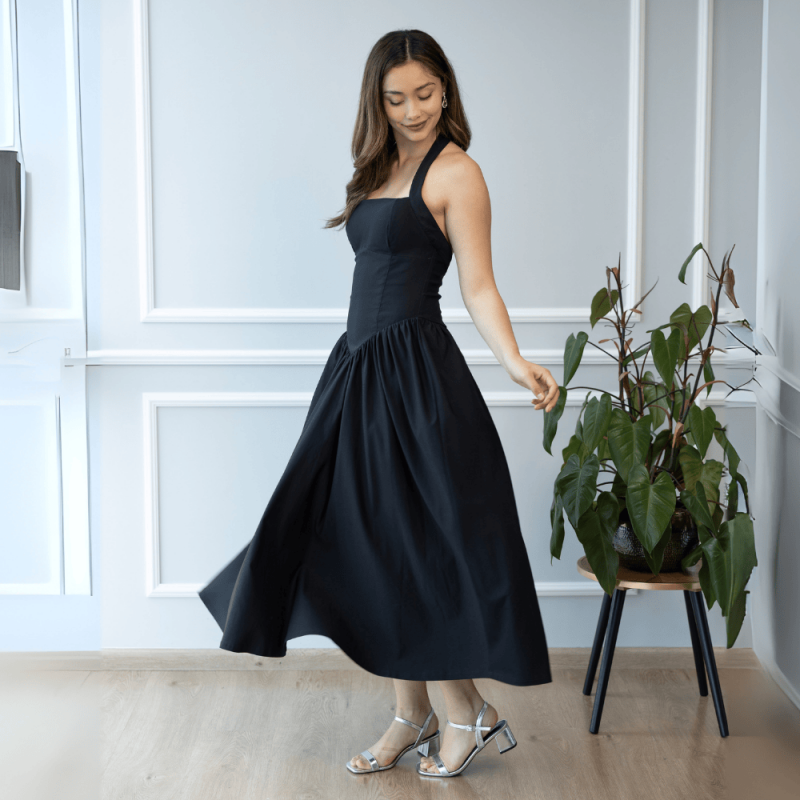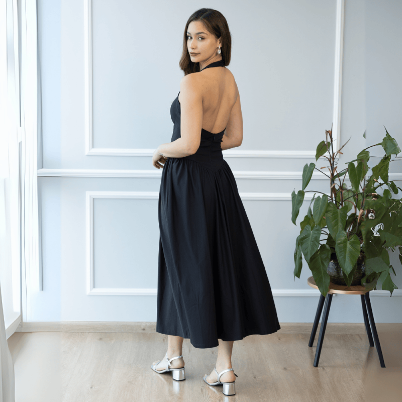 Precioso vestido midi con corpiño entallado y falda suelta.