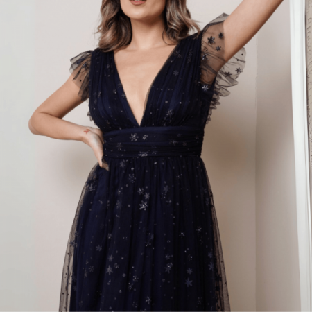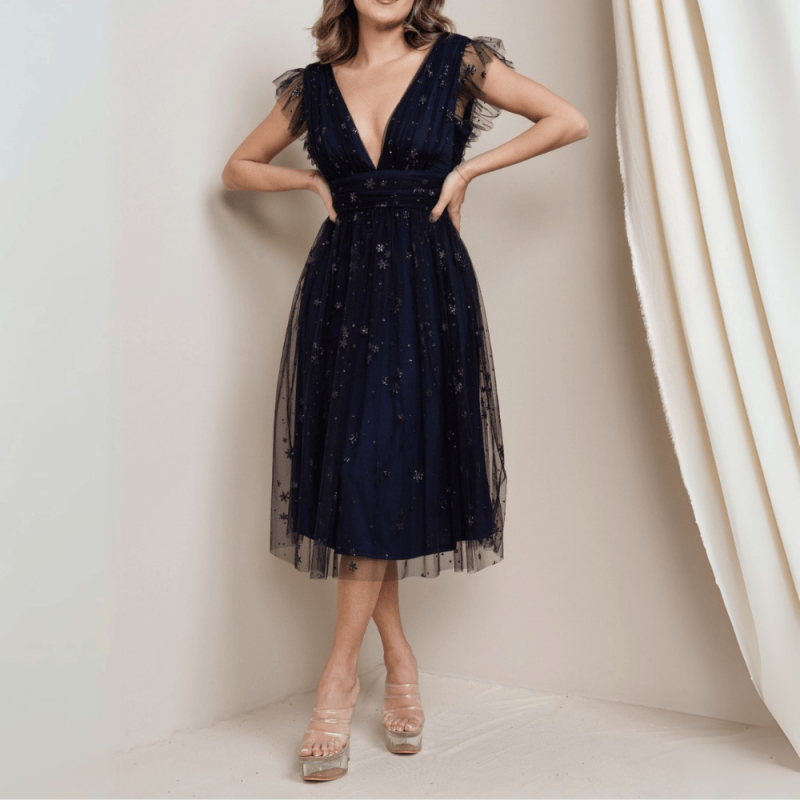 Hermoso vestido midi escarchado. cuenta con detalles en la parte delantera del corpiño y unas ligeras mangas caídas al hombro, tiene la falda con cruce en la parte delantera que hará lucir una abertura sexy. lleva copas para un mejor realce del busto. composición: 100% poliéster.