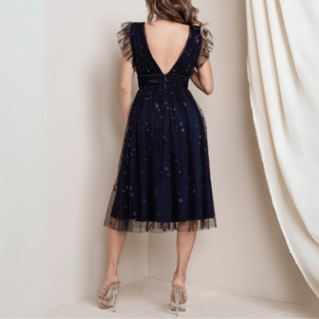 Hermoso vestido midi escarchado. cuenta con detalles en la parte delantera del corpiño, tiene la espalda con un escote súper sexy. lleva copas para un mejor realce del busto. composición: 100% polyester.