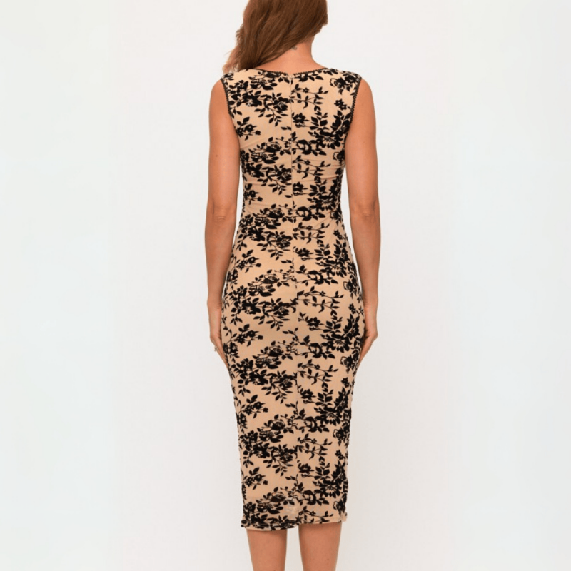 Hermoso vestido midi de gasa licra con apliques aterciopelados, lleva copas para un realce perfecto del busto.